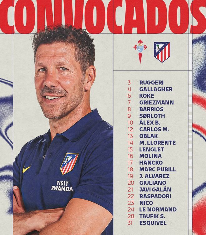 3-鲁杰里,4-加拉格尔、6-科克、7-格列兹曼、8-巴里奥斯、9-瑟洛特、10-巴埃纳、12-卡洛斯·马丁、13-奥布拉克、14-马科斯·略伦特、15-朗格莱、16-莫利纳、17-汉茨科、18-普比尔、19-阿尔瓦雷斯、20-朱利亚诺·西蒙尼、21-加兰、22-拉斯帕多里、23-尼科、24-勒诺尔芒、28-陶菲克·塞杜、31-埃斯基维尔