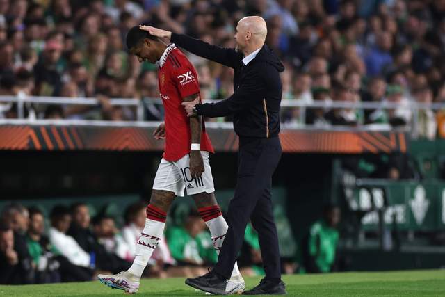 2022-23赛季欧联1/4决赛,曼联主场2-2战平塞维利亚,拉什福德因伤缺席;在客场,曼联0-3惨败,拉什福德踢了45分钟。